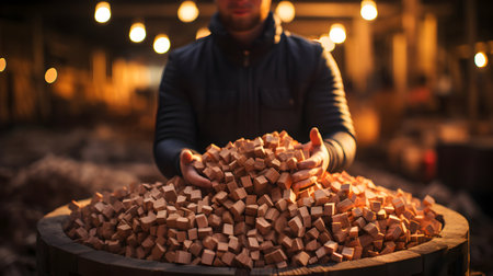 A dedicated craftsman skillfully assembles wooden blocks in a warm workshop. The image captures the intricate process of manual labor and craftsmanship in a rustic environment.