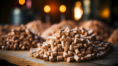 Pile of wooden pellets on a wooden background. Selective focus.