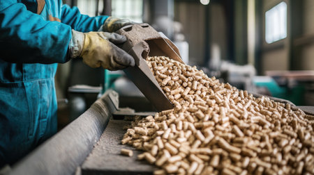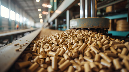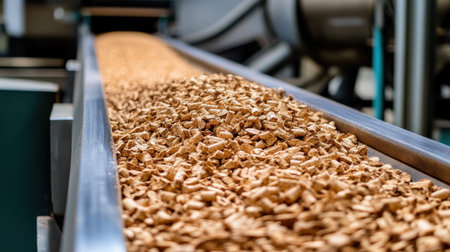 A vibrant view of wood pellets flowing on a conveyor belt in an industrial setting, highlighting the process of bioenergy production and sustainable fuel solutions.