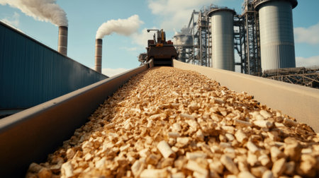 A close-up view of a conveyor belt transporting biomass fuel at an industrial energy plant, highlighting machinery and production processes in a sustainable environment.