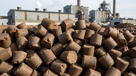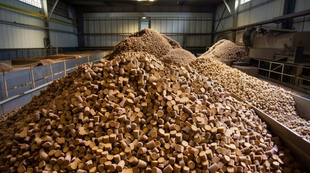 An industrial scene of a wood pellet production line, showcasing the process of pellet manufacturing.