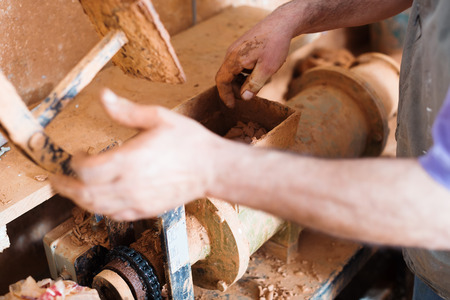 view on clay pressing manual machinery operated by worker in ceramics atelier