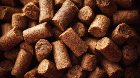 Close-up image of dry pet food pellets arranged in a textured layer. These nutritious morsels provide essential vitamins and minerals for pet health.
