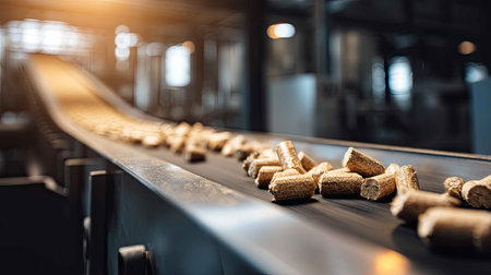 An industrial setting showcasing a conveyor belt transporting wood pellets in a factory. The image captures the intricate details of the movement and production process.