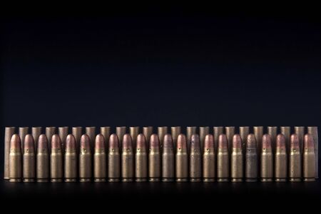 A lot of rifle ammo. AK-47 bullet cartridge. Armor piercing cartridge close up view. Underexposed photo.