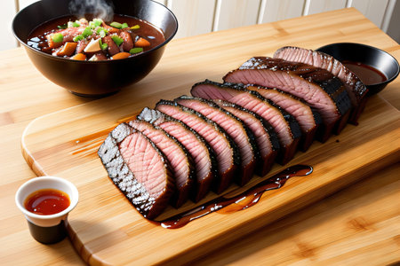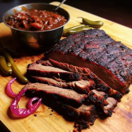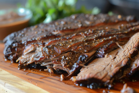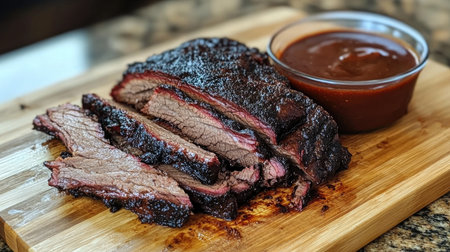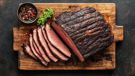 Close-up of juicy bbq beef brisket, sliced and seasoned, served on a rustic wooden chopping board