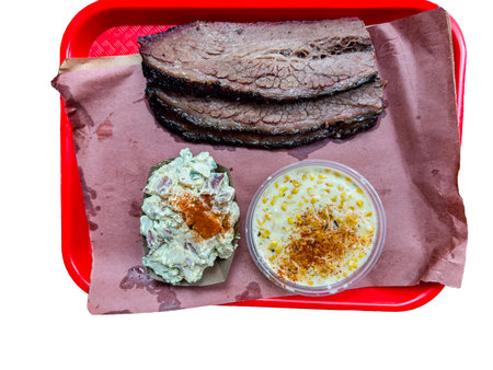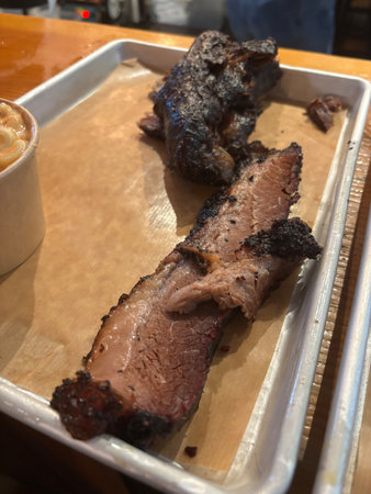 Beef brisket and ribs served at tray at food restaurant. readu to eat.