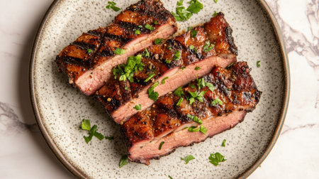 A beautifully plated dish of juicy grilled meat slices garnished with fresh herbs and spices, showcasing an inviting presentation ideal for culinary enthusiasts.