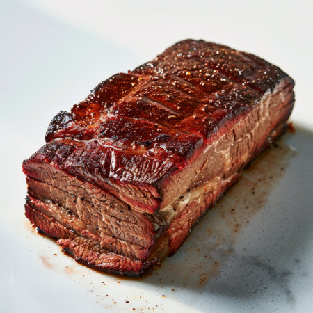 Juicy smoked meat captured in macro detail on a clean neutral background. Perfect for gourmet, food blogs, culinary content, and high-quality recipe