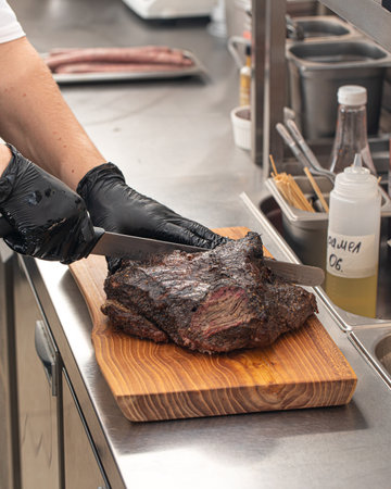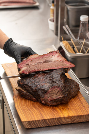 Cutting smoked brisket into slices in the kitchen
