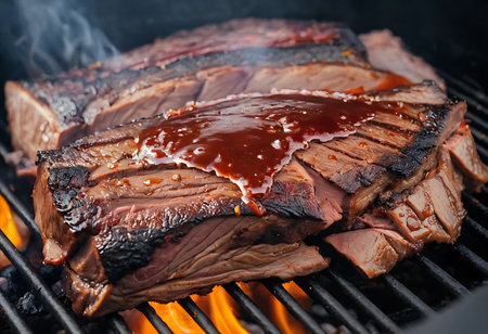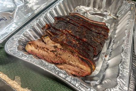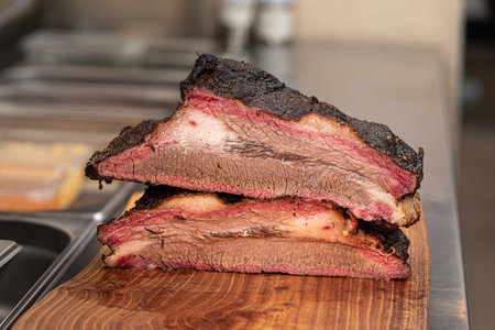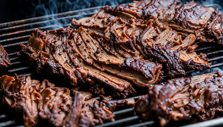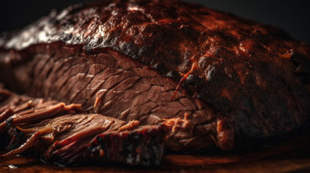 Close-up of authentic American barbecue brisket with a black bark, ready to be served from the grill