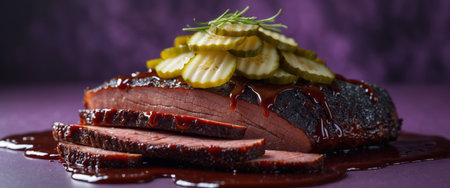 AI Generated. Flying smoked brisket with pickles and barbecue sauce on a deep purple background