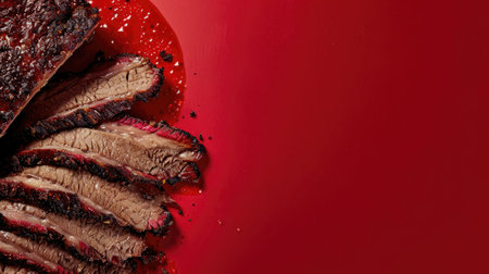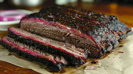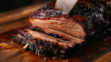A beautifully cooked and sliced beef brisket showcasing a smoky flavor and a perfect seared crust. Ideal for barbecues, gatherings or gourmet meals.