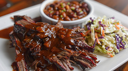 Savory pulled beef brisket with barbecue sauce, served with coleslaw and baked beans