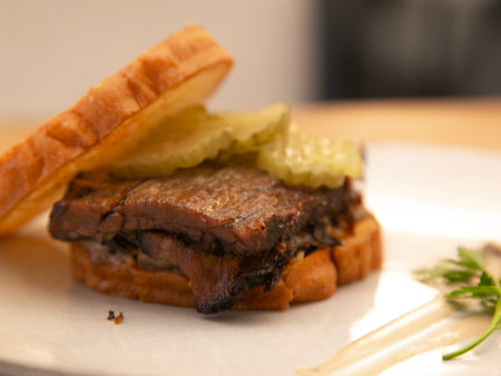 A mouthwatering smoked brisket sandwich served with fresh pickles. The beautifully stacked meat showcases rich flavors and textures, perfect for any barbecue lover.
