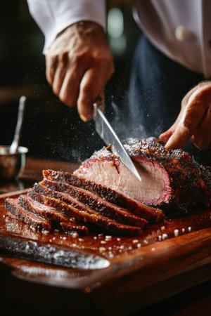 Expert Chef Slicing Juicy Brisket on Wooden Board - High Quality Food Photography for Culinary Designs
