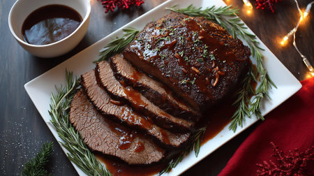 Tender brisket beautifully sliced, garnished with herbs, accompanied by a savory sauce.