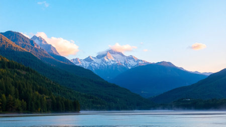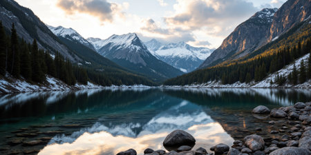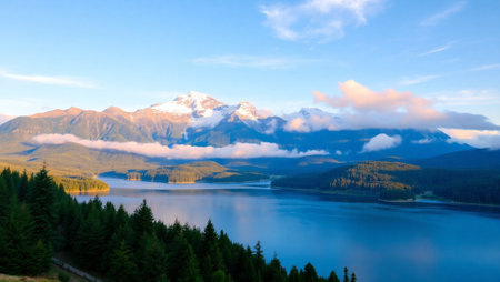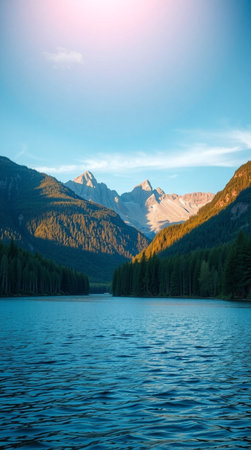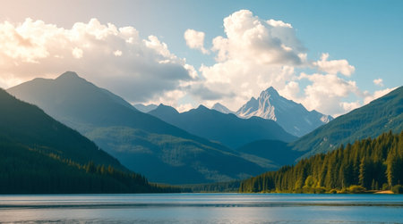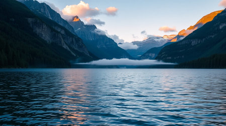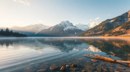 In the morning light a serene landscape unfolds, where the tranquil lake reflects the majestic mountains and their enchanting surroundings, creating a scene that feels both timeless and magical