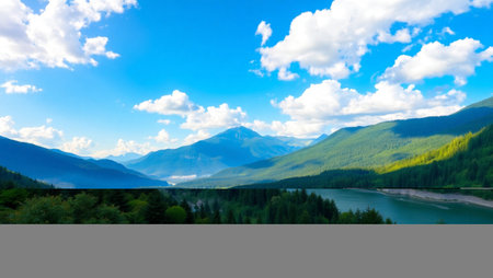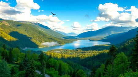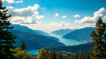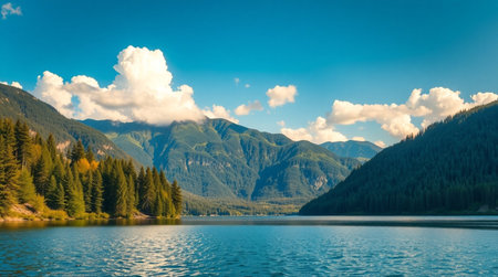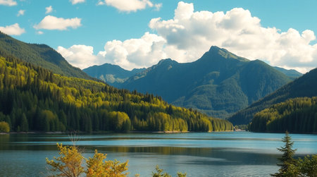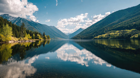 This stunning image captures a tranquil mountain lake surrounded by lush greenery and majestic mountains, reflecting a picturesque sky filled with clouds.