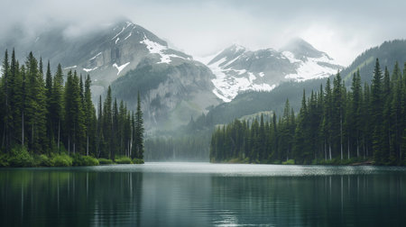 A serene lake nestled among lush pine trees and majestic mountains, creating a tranquil atmosphere. The calm water reflects the cloudy sky, inviting nature lovers to explore.