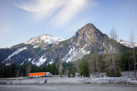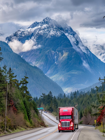 A red semi truck heads down a serene mountain highway, with the grandeur of towering cloud-kissed peaks in the distance