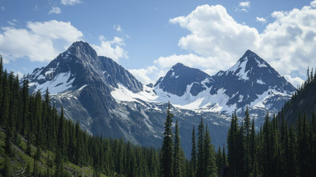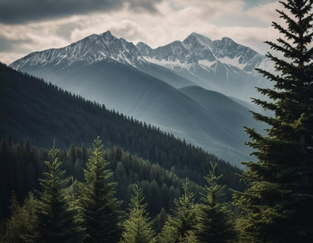 Majestic mountains tower over a serene spruce forest beneath a dramatic sky, showcasing nature beauty at dusk. Towering mountains with rolling hills and moody sky highlighting peaceful wilderness. AI.