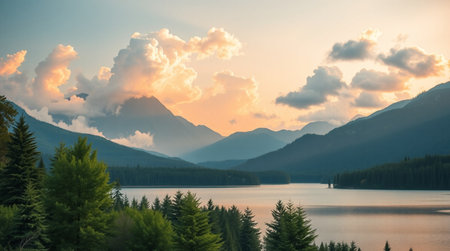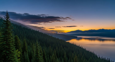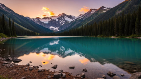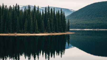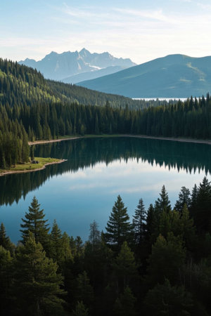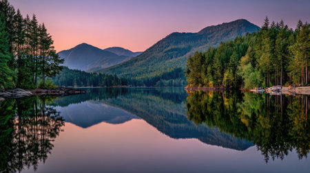 Experience the tranquil beauty of a mountain lake at dawn, where lush forests reflect perfectly on still water, creating a serene and picturesque landscape.