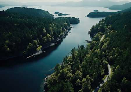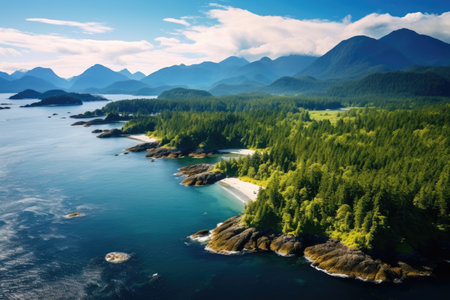 Aerial view of the sea and mountains. Beautiful nature of Norway, Landscape of Tofino covered in greenery surrounded by the sea in the Vancouver Islands, Canada, AI Generated