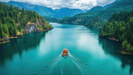 Experience a stunning aerial view of a vibrant boat sailing through tranquil waters, surrounded by lush forests and majestic mountains under a cloudy sky.