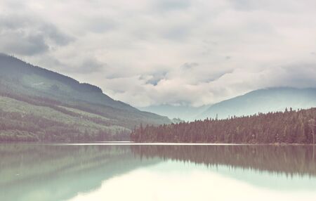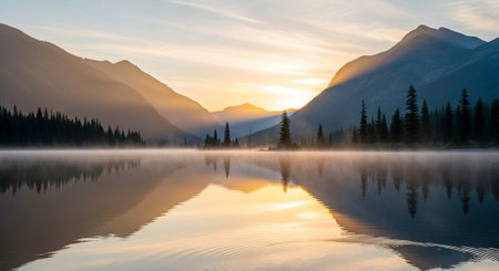 Mountain lake in the morning mist. Canadian Rockies, Alberta, Canada