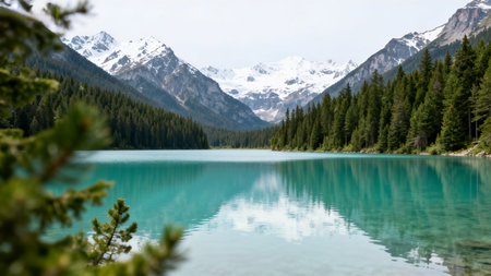 Glassy Mountain Lake with Snowy Peaks A perfectly still mountain lake reflects the towering snow-capped peaks above, creating a near-perfect