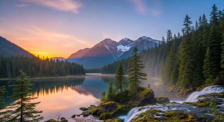Serene mountain lake reflecting dawn light with waterfall foreground