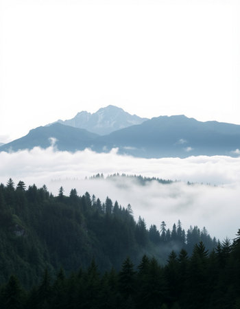Vancouver’s skyline emerges from the mist, framed by towering mountains and lush trees, creating a serene landscape on a cloudy day.