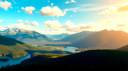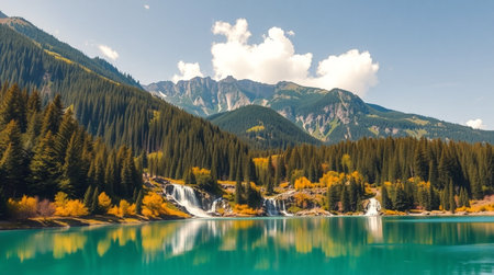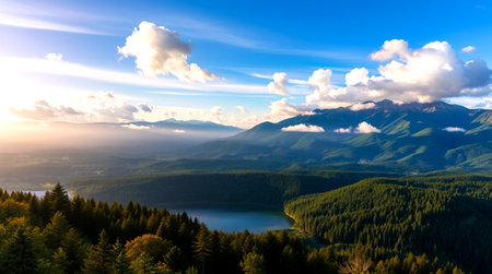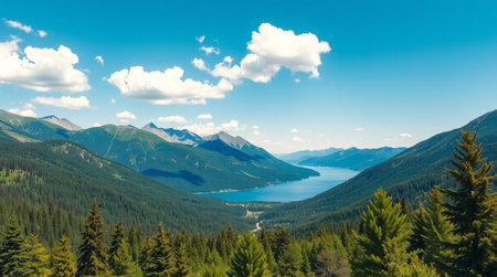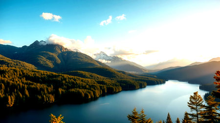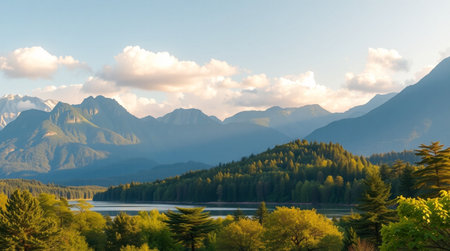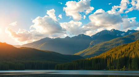 Beautiful mountain landscape with lake, forest and mountains in the background