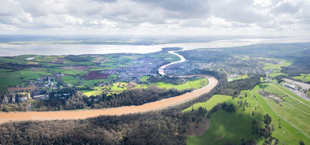 Amazing aerial panorama view of the Chepstow, River Wye, Monmouthshire, Wales, England, UK
