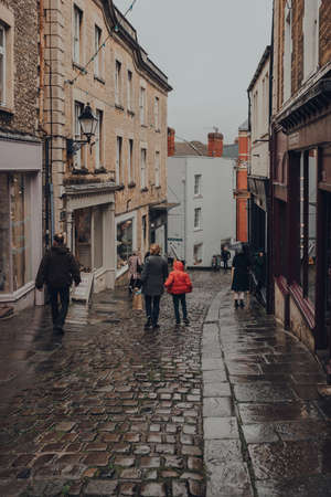 Frome, UK - October 04, 2020: People walk past shops on a street in Frome, a market town in the county of Somerset, UK, famous for its market and independent shops.