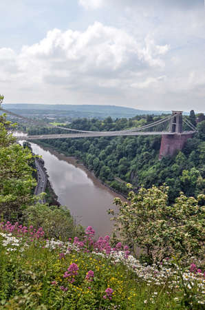 Bristol, England, June 1, 2014: view from a slope with wildflowers towards the Clifton suspension bridge across the river Avon