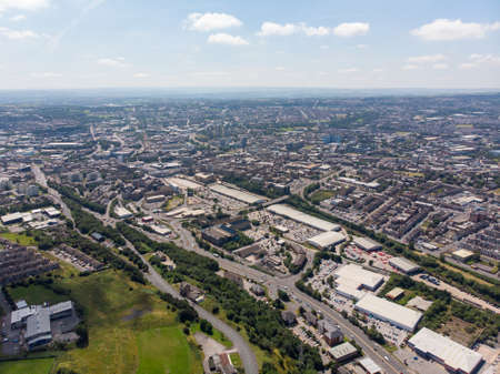 Aerial photo of the British West Yorkshire town of Bradford, showing a typical housing estate in the heart of the city, taken with a drone on a bright sunny day