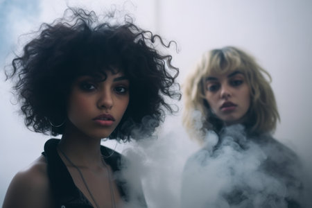 two young women with curly hair standing in front of smoke