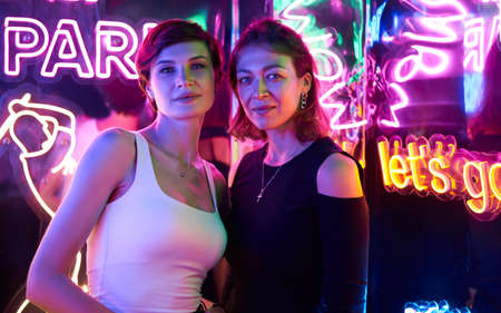 Image of two beautiful women in an amusement park in a room with neon light. entertainment concept. mixed media