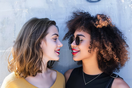 Two modern girls dressed in stylish clothes kiss affectionately on a bustling street surrounded by impressive mirrored high rises. This moment reflects love and equality in an urban setting.