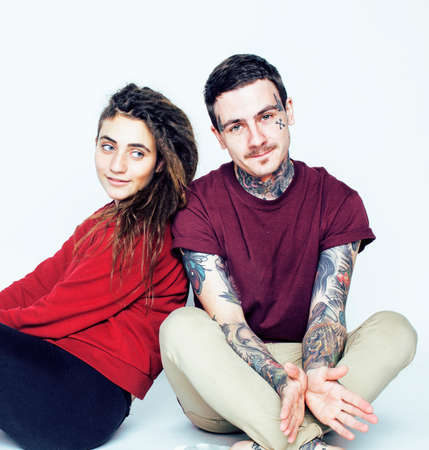 Young couple together. guy with tattoo, girlfriend wearing dreadlocks having fun on white background