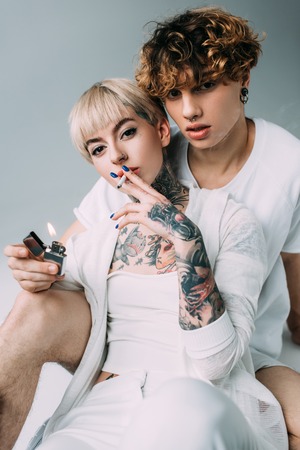 blonde tattooed girl holding cigarette in mouth near handsome man with lighter in hand isolated on grey
