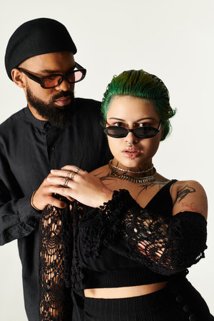 A fashionable couple showcases their unique style while wearing stylish sunglasses in the studio.