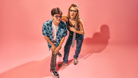 Stylish Gen Z friends posing in retro-inspired streetwear on pink background