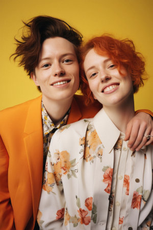 Portrait of happy lesbian couple embracing each other on yellow background.