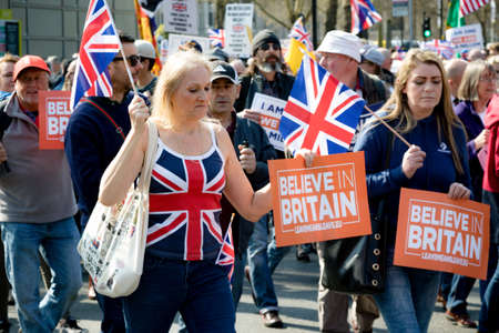 London, United Kingdom, March 29th 2019:- Pro Brexit marchers outside the British Parliament on the day the UK should have left the EU