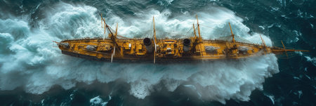 Charred Relic: Haunting Shipwreck Amidst Tempestuous Seas