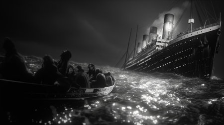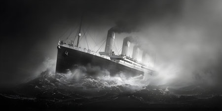 Iconic tragedy the sinking of the RMS Titanic in black and white. Concept Titanic History, Maritime Disaster, RMS Titanic, Sinking Tragedy, Black and White Photography