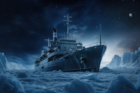 An AI-generated illustration of an old-fashioned passenger liner navigating through icebergs